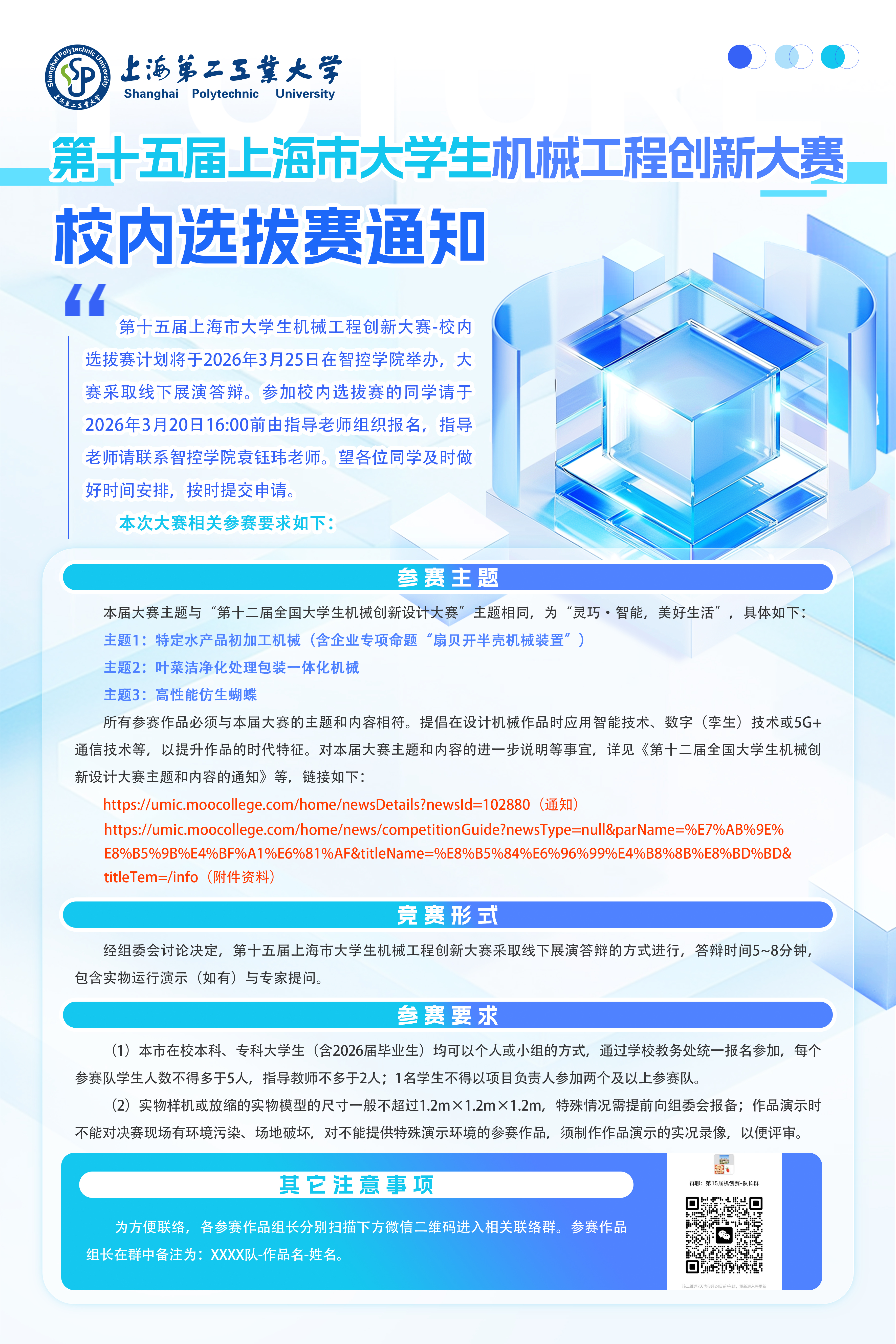 第十五届上海市大学生机械工程创新大赛-校内选拔赛计划将于2026年3月25日在智控学院举办,大赛采取线下展演答辩。参加校内选拔赛的同学请于2026年3月23日16:00前由指导老师组织报名,指导老师请联系智控学院袁钰玮老师。望各位同学及时做好时间安排,按时提交申请。